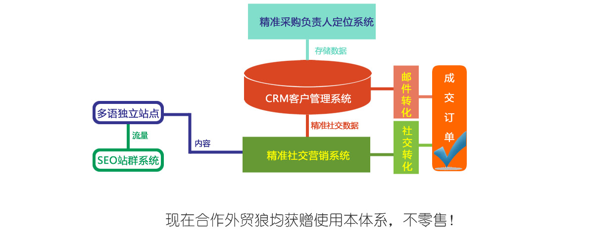 我们不做您看见过的社交系统,我们要做的是您没有看见过的,甚至是您没有想到的!因为我们更懂您的痛! 我们会基于全球知名社交平台和搜索引擎(Facebook、Linkedin、Google、Twitter、VK、Youtube等超过200个社交平台)开发一套精准外贸社交营销系统,并结合外贸狼产品线使用,对了,您很锐利,注意,是【精准】社交!