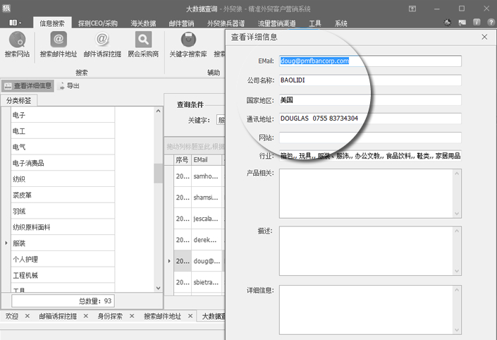 1、软件内置邮箱提取功能,批量提取网站邮箱线索 2、根据网站找到的某一个邮箱,深度挖掘公司所有人邮箱; 3、探测CEO/采购功能,可一键分析所有邮箱的职位信息; 4、所有职位信息里面,系统自动匹配出采购类关键人出来; 5、简单操作,高效运行,结果准确; |