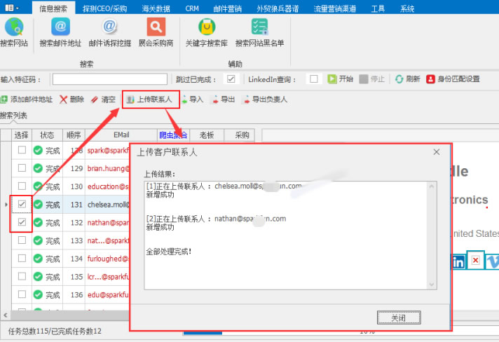 将客户存储到客户CRM数据库 可选择多个采购负责人 选择“上传联系人” 可一键直接存储到 外贸狼CRM客户管理系统 |