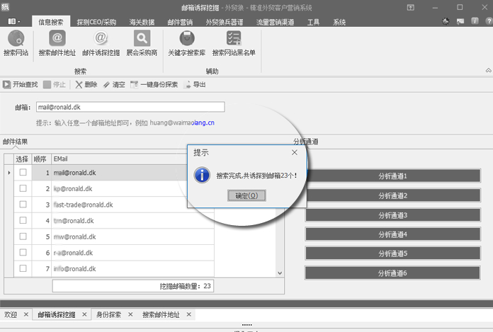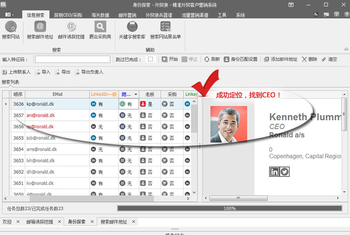 1、根据产品线索找到某一个邮箱,深度挖掘所有人邮箱; 2、探测CEO/采购功能,可一键分析所有邮箱的职位信息; 3、所有职位信息里面,系统自动匹配出采购类关键人出来; 4、简单操作,高效运行,结果准确; |
